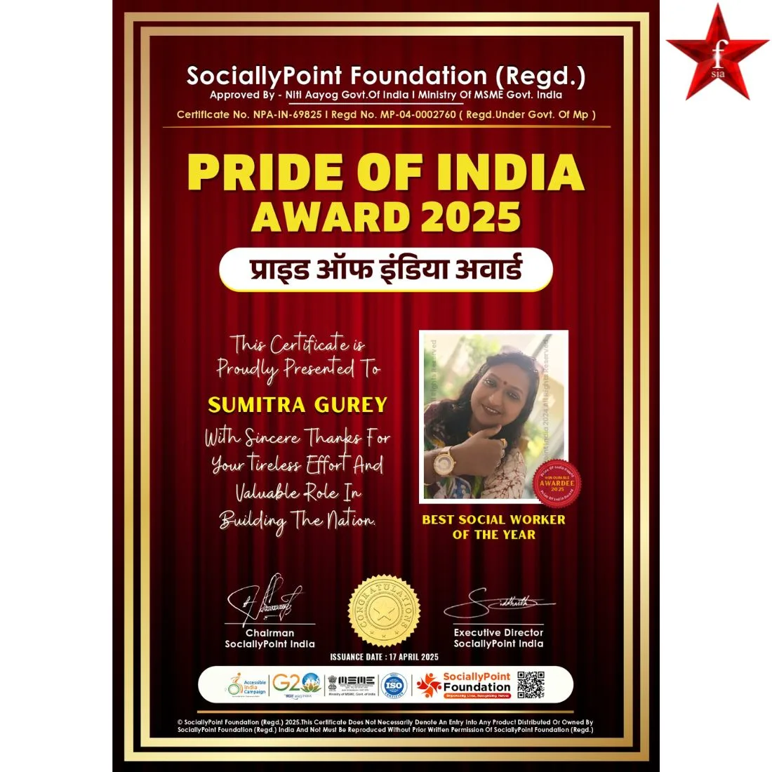 Social Activist Title to Sumitra Gurey from Kolkata