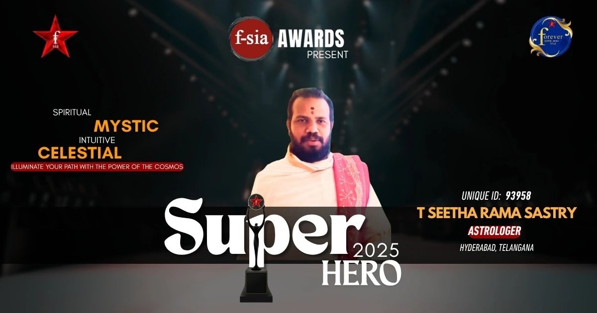 What started as a young boy’s curiosity in the sacred sciences transformed into a lifelong mission of service and guidance. Over two and a half decades, T. Seetha Rama Sastry has performed thousands of ceremonies that have touched countless lives. His commitment to Sanatana Dharma, precision in astrology, and compassionate consultation style have made him a trusted Astrologer from Hyderabad and an inspiration to aspiring Vedic scholars. His recognition as a Super Hero 2025 Awardee by Forever Star India Awards marks his invaluable contribution to the field of astrology and temple service. From conducting rituals to leading religious communities, his success is not measured by fame but by faith the faith he inspires in every individual he serves.
