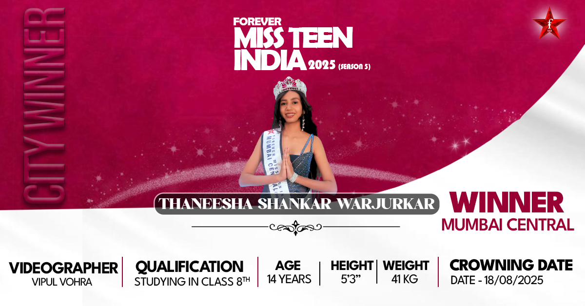 Thaneesha Shankar Warjurkar is a proud representative of Miss Teen Mumbai Central 2025, recognised by Forever Star India. She is an energetic and multi-skilled young star who embodies the new generation of young people who balance academics, athletics, creativity, and social consciousness equally well. Full of passion, ambition, and discipline, Thaneesha is more than passionate in her modeling; her passion is her mission, and her crown is not a mere title but a mission to fulfill with pride. With forward forward-looking career in the beauty pageant industry, she is aiming to use the network opportunities provided by Forever Star India.