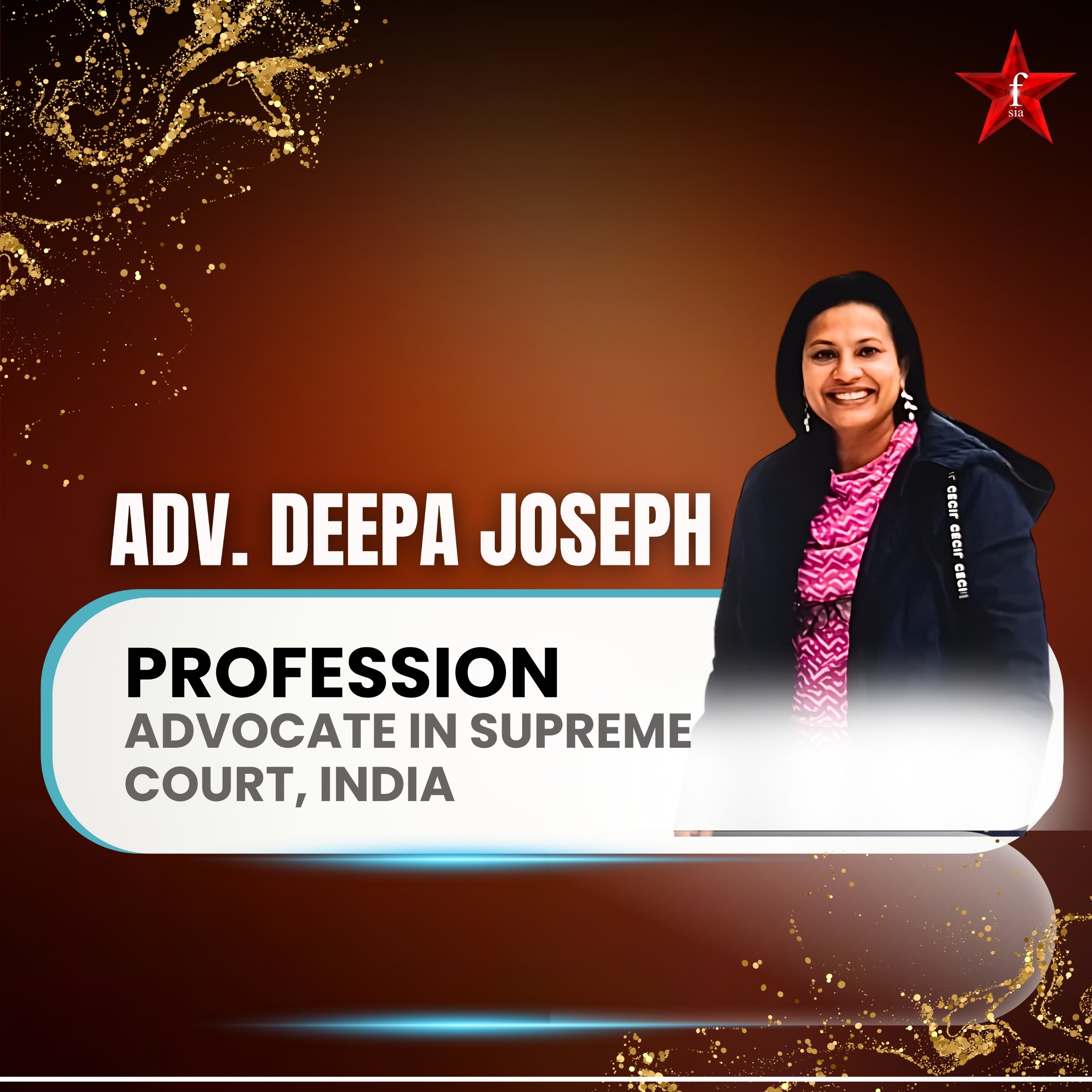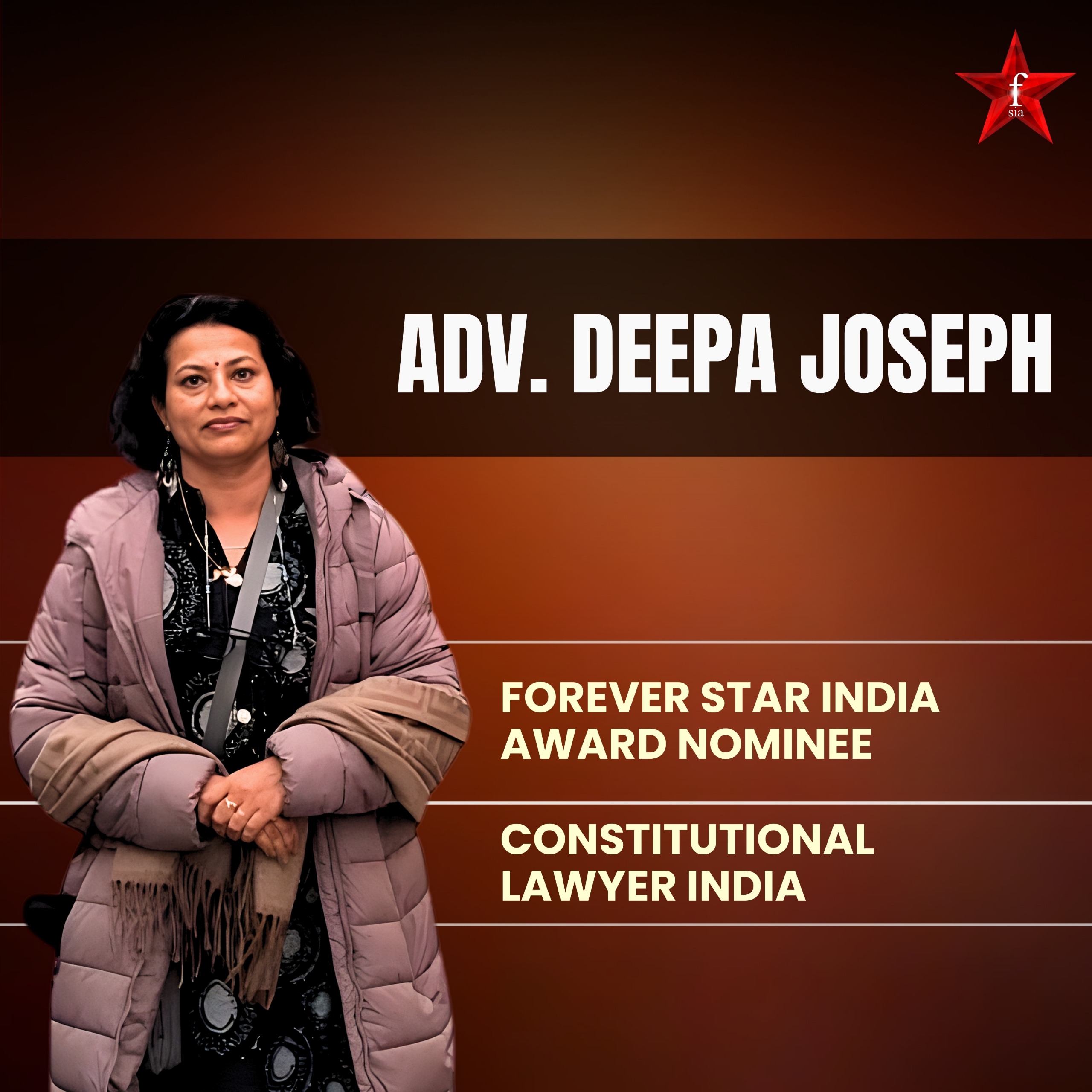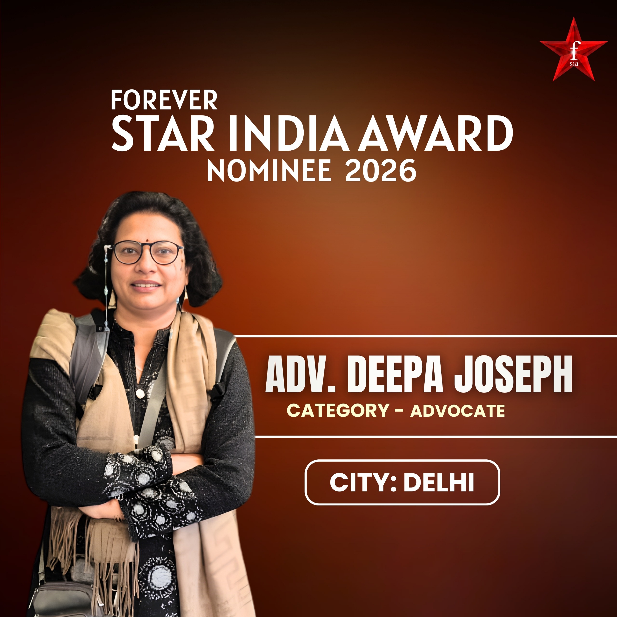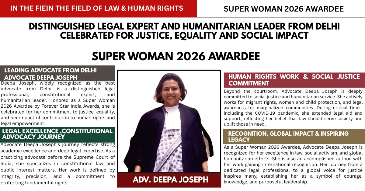 Advocate Deepa Joseph, widely recognized as the best Supreme Court advocate from Delhi, is a distinguished legal professional, constitutional expert, and humanitarian leader known for her unwavering commitment to justice, equality, and social reform. Honored as a Super Woman 2026 Awardee by Forever Star India Awards and also recognized among Super Woman 2025 Awardees, she stands as a prominent super woman awardee in advocate category. Known as advocate Deepa Joseph, she has built a powerful reputation as a Supreme Court advocate from Delhi, combining legal excellence with social responsibility, and emerging as a leading legal activist India and human rights advocate Delhi.